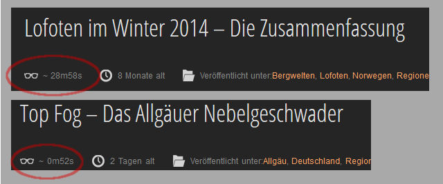 In den jeweilgen Artikeln findet Ihr jetzt in der Kopfmeta eine ungefähre Lesedauer des jeweilgen Artikels. Zu erkennen am Brillensymbol. Nicht berücksichtig wird natürlich die Zeit, in der Ihr die Bilder schaut. In den Artikel selbst wurde die Schriftgröße noch auf 12 angepasst und der Text erscheint nun im Blocksatz.