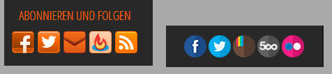 Der „Pagelikebutton“ für meine Facebooksite sitzt jetzt direkt unter den neuen bunten Smar… ähm Socialpins, welche ebenfalls angepasst wurden. Aus hässlichem Orange wurden schöne kleine Flatbuttons, die Euch zu meinen anderen Präsentationsplattformen bringen. Der Schriftzug „Abonnieren und folgen“ wurde ebenfalls entfernt. Da wir gerade beim Menü sind, die Trennlinien zwischen den Menübereichen wurde ebenso wie das Artikelauswahlarchiv und die Seitensuche vollständig ausradiert.