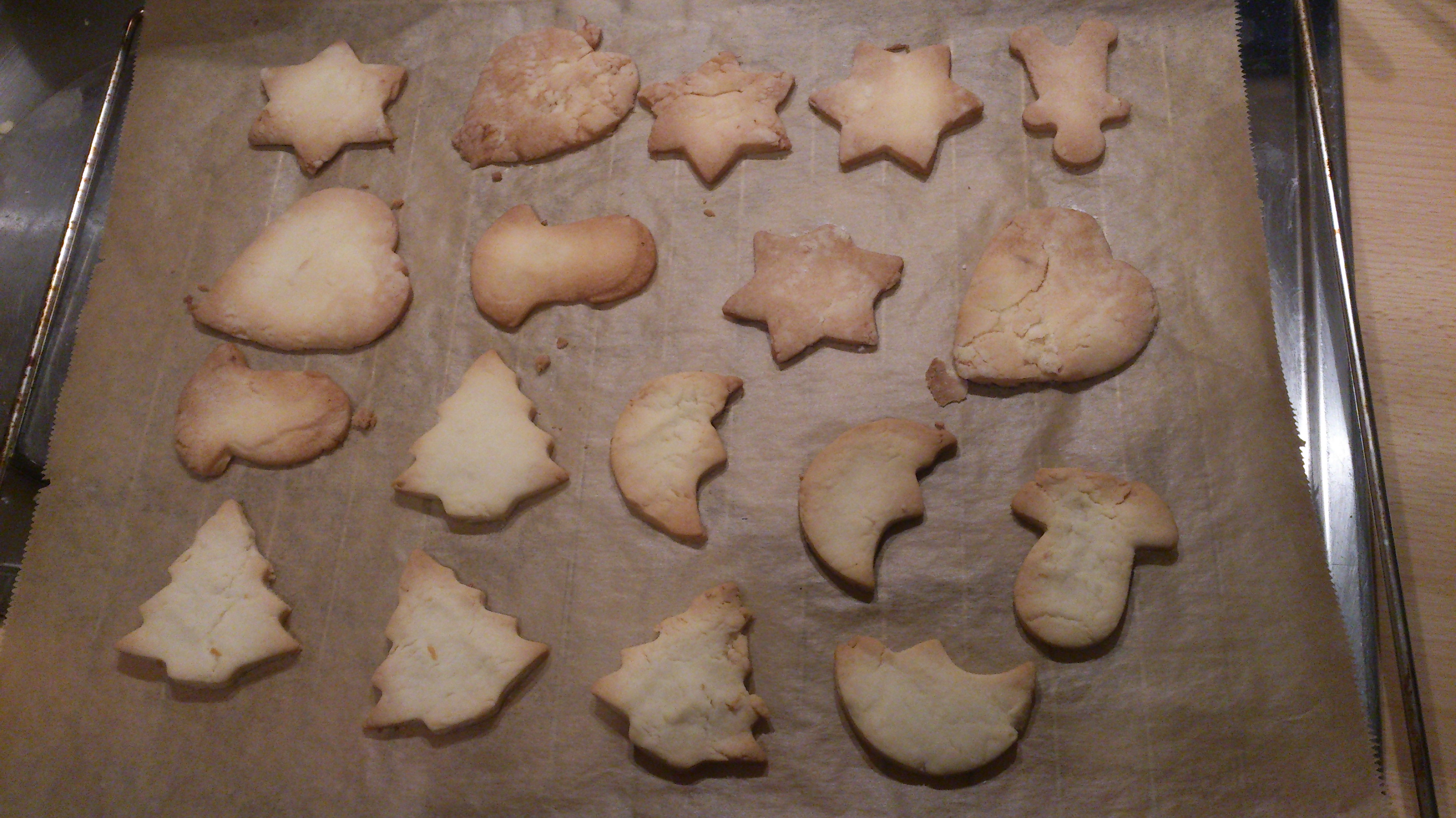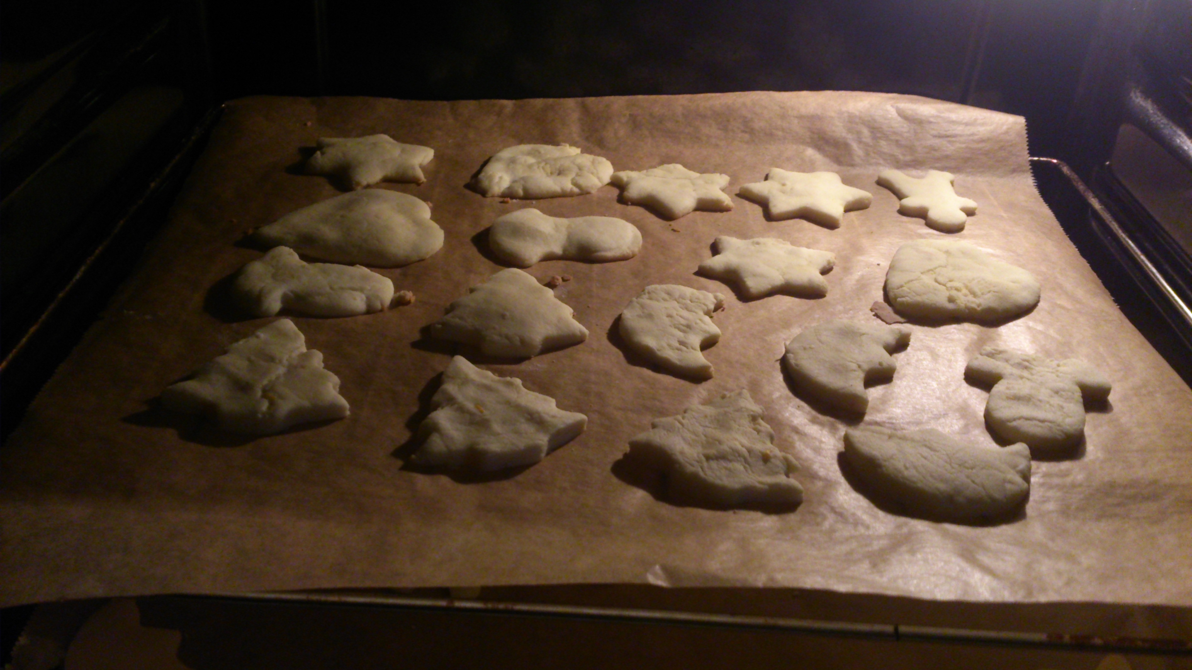 Teig nochmals kurz durchkneten und je nach gewünschter Plätzchendicke ausrollen. Mit den Motiven Plätzchen ausstechen, diese auf ein mit Backpapier ausgelegtes Backblech legen und bei 180°C (Umluft) ca. 8-10 Minuten goldgelb backen.