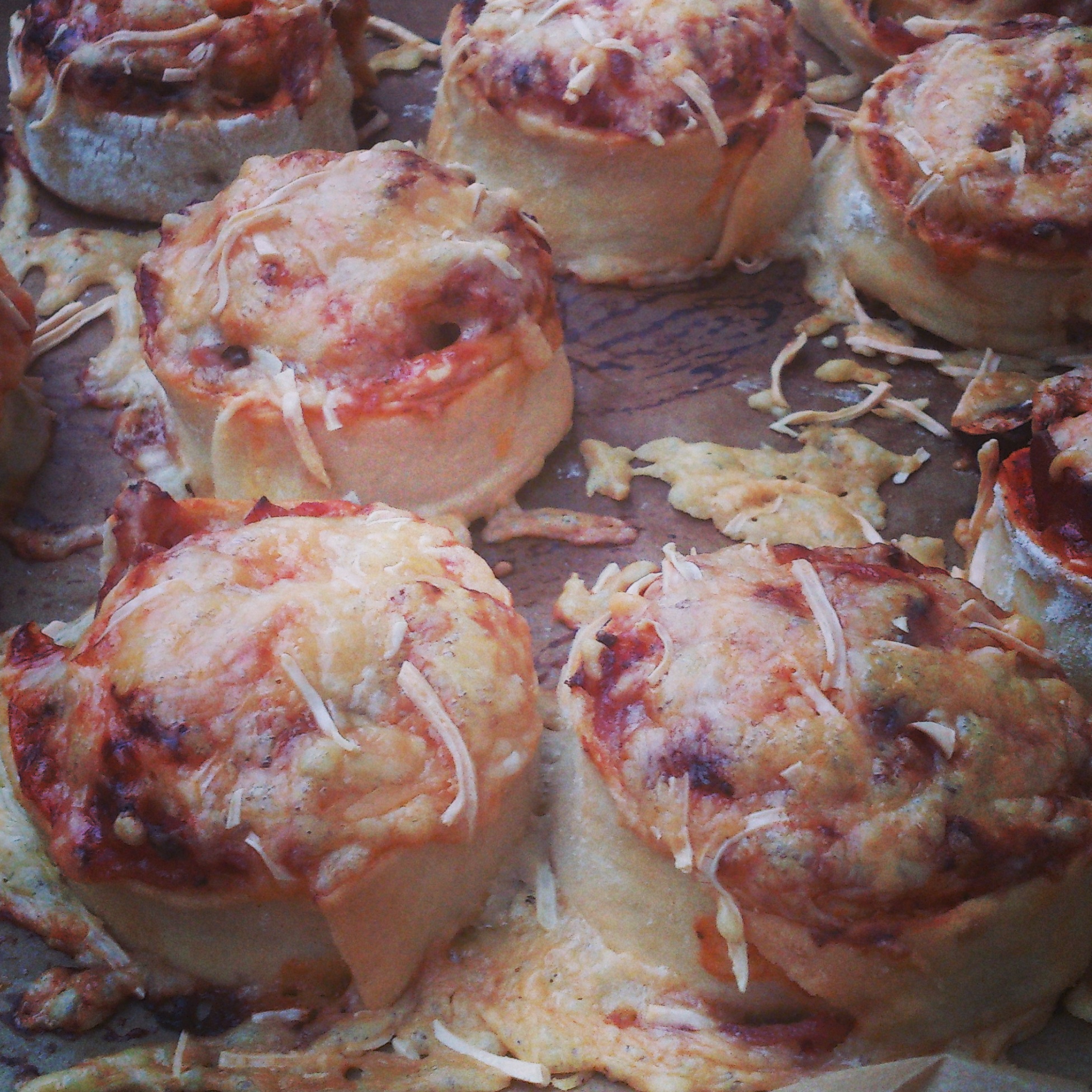 Den Teig dünn ausrollen, nach Belieben belegen und zusammen rollen. Nun die Rolle in etwa 2 cm dicke Scheiben schneiden, auf ein mit Backpapier ausgelegtes Backblech legen und Käse darüber streuen.