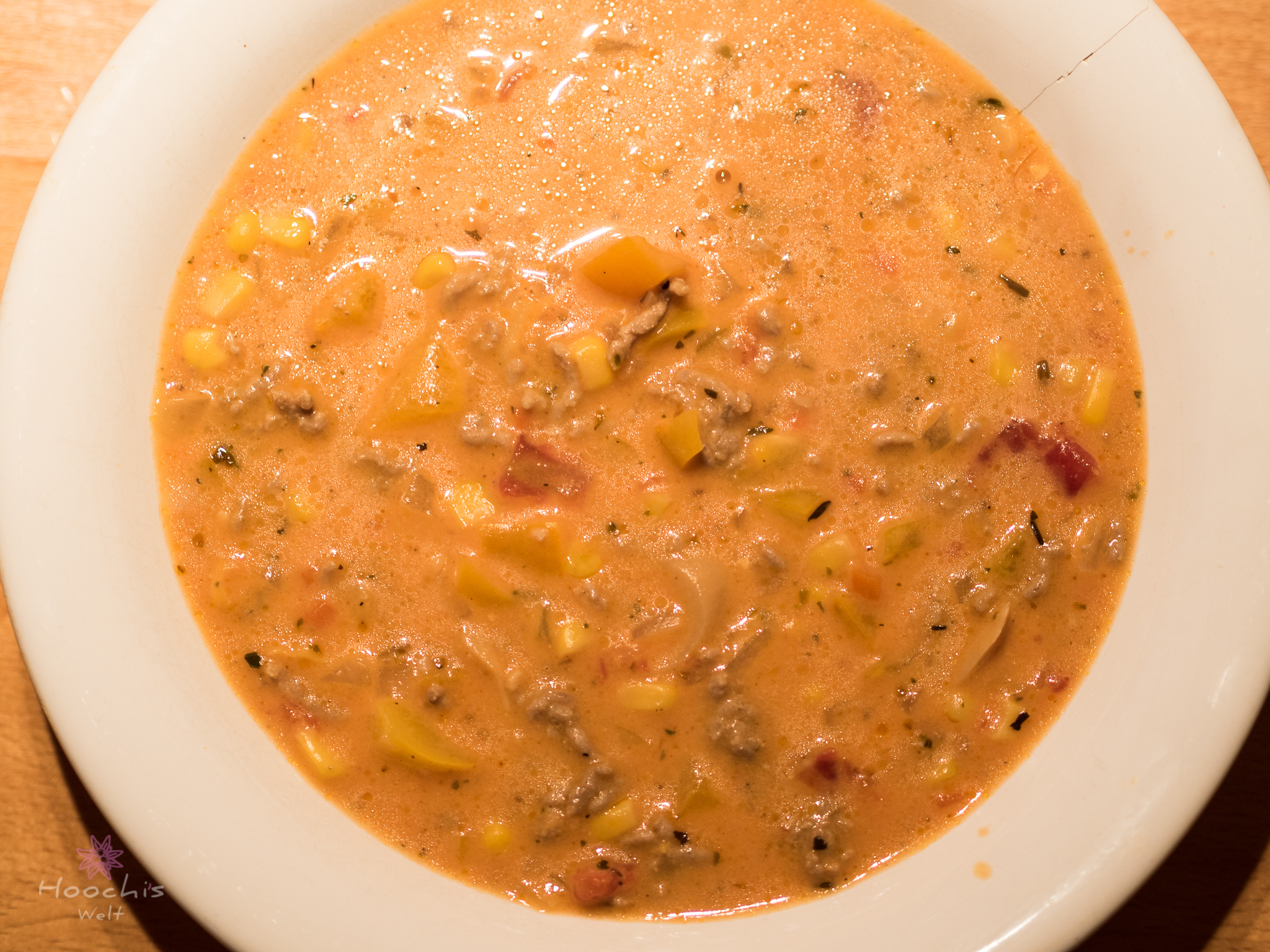 Einen großen Topf herrichten, das Olivenöl darin erhitzen und das Hackfleisch anbraten. Zwiebeln schälen, in Würfel schneiden und zum Hackfleisch geben. Paprika würfeln und mit den Champignons und dem Mais in den Topf geben. Kürz andünsten lassen und anschließend mit der Gemüsebrühe ablöschen. Die Sahne, die Tomatensauce und den Sahneschmelzkäse hinzugeben und ca. 10 Minuten köcheln lassen. Zum Schluss mit Salz, Pfeffer und Oregano würzen.