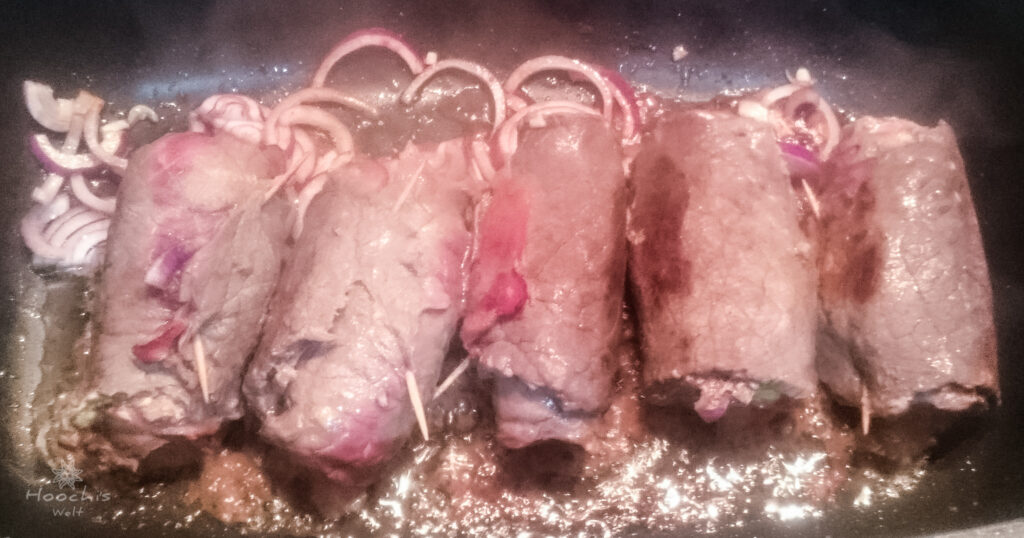 Das machst du, bis alle Rouladen gerollt sind. Nun wird das Öl in einem großen Topf erhitzt und die Rouladen von allen Seiten scharf angebraten. Nun kommen die Zwiebeln dazu, die du zu Beginn zur Seite gelegt hast und lässt sie kurz mitdünsten. Nun mit Bratensoße auffüllen und etwa 1,5 Stunden köcheln lassen. Das Fleisch sollte zart gekocht sein.