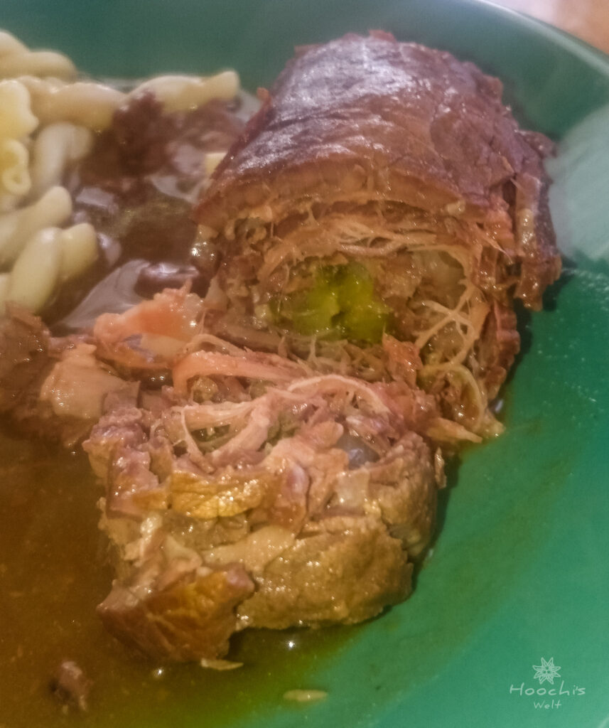 Das Fleisch auf die Arbeitsfläche legen und eine Seite gut mit Senf einstreichen, würzen (Achtung! Rauchfleisch könnte salzig werden, also lieber vorsichtig würzen) und mit jeweils 2 Scheiben Rauchfleisch belegen (kommt auf die Größe des Fleisches an). Darauf verteilst du nun ein paar Zwiebelscheiben und legst an ein Ende die Essiggurke. Anschließend wird alles zusammen gerollt und mit dem Zahnstocher geschlossen, damit die Roulade nicht auseinander fällt.
