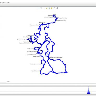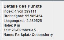 Direkt darunter findet man die Wegpunkte, die sogenannten POI’s. In meinem Fall ist es eine Mischung aus POI’s, die ich direkt am Tracker gesetzt und Punkte, die ich nachträglich manuell in Google-Earth gesetzt habe. GpsPrune ist das egal und zeigt alle erkannten Informationen in dieser Liste an.