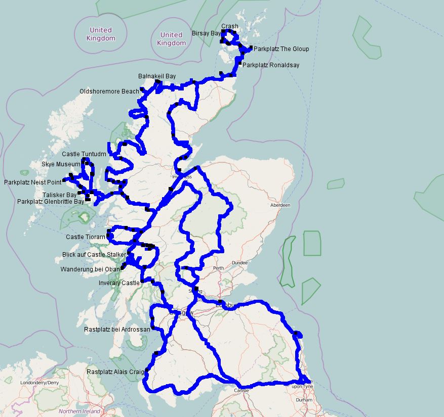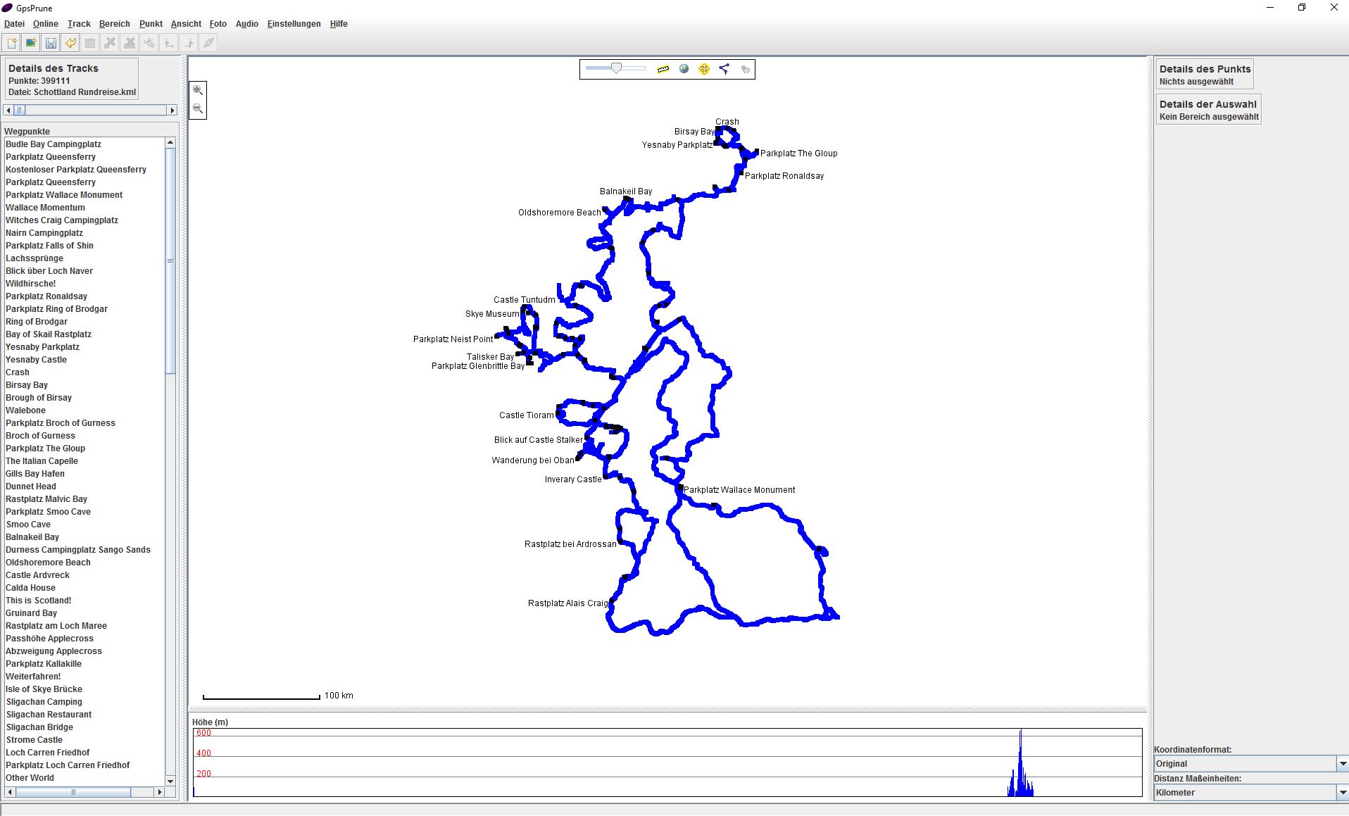 Direkt darunter findet man die Wegpunkte, die sogenannten POI’s. In meinem Fall ist es eine Mischung aus POI’s, die ich direkt am Tracker gesetzt und Punkte, die ich nachträglich manuell in Google-Earth gesetzt habe. GpsPrune ist das egal und zeigt alle erkannten Informationen in dieser Liste an.