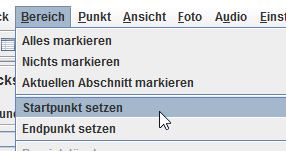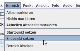 Möchte man den Track zuschneiden, kann man dies über verschiedene Wege tun. Zuerst lassen sich bestimmte Trackabschnitte über das Setzen eines Start- und Endpunktes markieren. Man markiert zunächst den Startpunkt über das Menü „Bereich“ -> „Startpunkt setzen“. Danach markiert man sich die Stelle im Track, bis dahin man den Track selektieren möchte. Über „Endpunkt setzen“ wird nun der Track vom Start- bis Endpunkt markiert (siehe Screenshot 4).