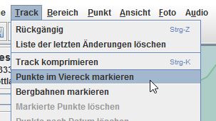 Eine andere Möglichkeit mehrere Trackpunkte zu markieren stellt das „Viereck“-Tool dar. Dies ist allerdings mit Vorsicht zu genießen, weil dahinter direkt die „löschen“-Funktion gekoppelt ist! Möchte ich für die Einzelartikel nur einen Teilabschnitt der Gesamtkarte herausstellen, arbeite ich überwiegend mit diesem Tool, da man so sehr schnell, sehr viele Punkte löschen kann.