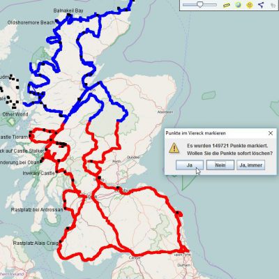 Dazu wählt man im Menü „Track“ -> „Punkte im Viereck markieren“ aus. Nun klickt man auf die Karte, hält die Maustaste gedrückt und zieht einen roten Rahmen um den gewünschten Bereich. Die Trackpunkte innerhalb des Rahmens werden nun rot markiert und möchten anschließend direkt gelöscht werden. Wie Ihr die nun aufpoppende Frage beantwortet, liegt in Euren Händen.