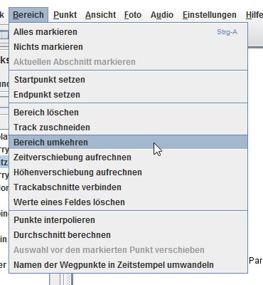 Ich habe zwei Segmente, insgesamt 215 Punkte. Die zwei Enden, welche ich zus.führen möchte, haben die Nummern 169 und 215. Ich habe herausgefunden, dass die Nummern jedoch aufeinanderfolgen müssen. Man klickt dann also in meinem Falle das zweite Segment an und wählt unter dem Reiter „Bereich“ die Funktion „Aktuellen Bereich markieren“ und danach „Bereich umkehren“. Das zweite Segment fängt nun mit Nummer 170 an. Dann „Bereich“ + „Alles markieren“ und „Trackabschnitte verbinden“. Dann sollten die zwei Segemente verbunden sein. Probierts ma aus und wenn noch immer Probleme auftreten, schreibt mir.