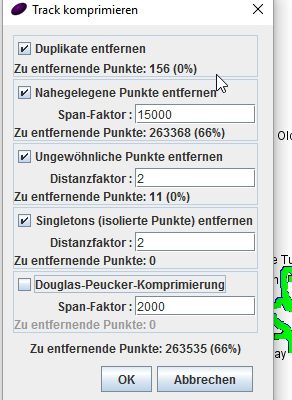 Hier definiert Ihr den Abstand der Trackpunkte. Je höher der Span-Faktor, desto mehr Punkte bleiben der Karte erhalten. In meinem Fall habe ich einen relativ hohen Wert eingestellt, trotzdem werden über die Hälfte (66%) der Punkte entfernt.