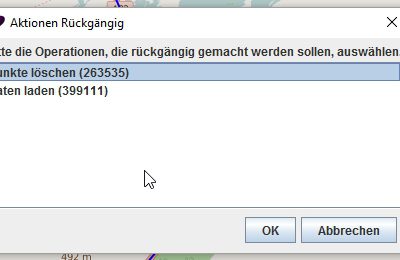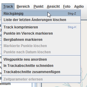 Keine Angst, i.d.R. könnt Ihr nichts kaputt machen. Wie jede anständige Software, hat auch GPSprune eine „Rückgängig“-Funktion. Über den Menüpunkt „Track“ -> „Rückgängig“ öffnet sich ein Verlaufsprotokoll. Hier könnt Ihr sogar auswählen, bis zu welchem Verarbeitungsschritt Ihr die Karte wiederherstellen möchtet. Wie viele dort gespeichert werden, weiss ich nicht. Es wird aber definitiv endlich sein.