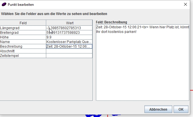 Im vorangegangen Abschnitt haben wir bereits Trackpunkte und POI’s markiert. Nun wollen wir diese Punkte auch bearbeiten. Über das Menü „Punkt“ und „Punkt bearbeiten“ kommen wir in das Bearbeitungsfenster. In diesem lassen sich sämtliche Informationen händisch Nachbearbeiten. Die GPS-Koordinaten habe ich noch nie geändert, allerdings ist es nicht schlecht, dass sich hier auch Name und Beschreibung ändern lassen. Später in z.B. Google-Maps werden diese dann auch dementsprechend übernommen