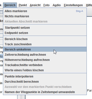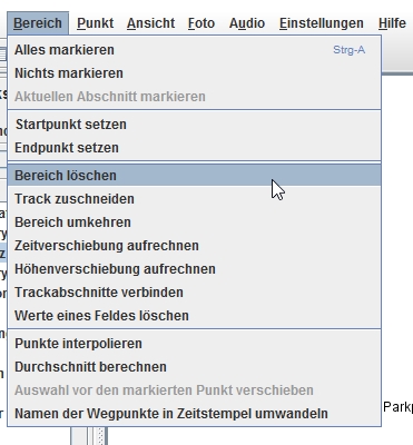 Möchte man den Track zuschneiden, kann man dies über verschiedene Wege tun. Zuerst lassen sich bestimmte Trackabschnitte über das Setzen eines Start- und Endpunktes markieren. Man markiert zunächst den Startpunkt über das Menü „Bereich“ -> „Startpunkt setzen“. Danach markiert man sich die Stelle im Track, bis dahin man den Track selektieren möchte. Über „Endpunkt setzen“ wird nun der Track vom Start- bis Endpunkt markiert (siehe Screenshot 4).