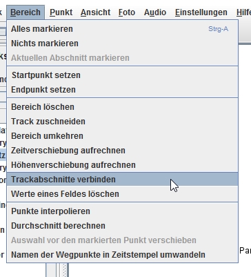 Ich habe zwei Segmente, insgesamt 215 Punkte. Die zwei Enden, welche ich zus.führen möchte, haben die Nummern 169 und 215. Ich habe herausgefunden, dass die Nummern jedoch aufeinanderfolgen müssen. Man klickt dann also in meinem Falle das zweite Segment an und wählt unter dem Reiter „Bereich“ die Funktion „Aktuellen Bereich markieren“ und danach „Bereich umkehren“. Das zweite Segment fängt nun mit Nummer 170 an. Dann „Bereich“ + „Alles markieren“ und „Trackabschnitte verbinden“. Dann sollten die zwei Segemente verbunden sein. Probierts ma aus und wenn noch immer Probleme auftreten, schreibt mir.
