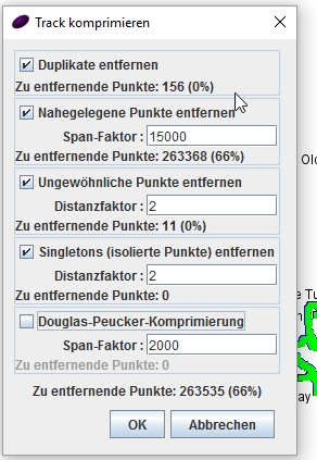 Hier definiert Ihr den Abstand der Trackpunkte. Je höher der Span-Faktor, desto mehr Punkte bleiben der Karte erhalten. In meinem Fall habe ich einen relativ hohen Wert eingestellt, trotzdem werden über die Hälfte (66%) der Punkte entfernt.