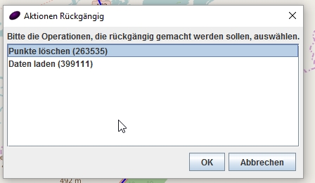 Keine Angst, i.d.R. könnt Ihr nichts kaputt machen. Wie jede anständige Software, hat auch GPSprune eine „Rückgängig“-Funktion. Über den Menüpunkt „Track“ -> „Rückgängig“ öffnet sich ein Verlaufsprotokoll. Hier könnt Ihr sogar auswählen, bis zu welchem Verarbeitungsschritt Ihr die Karte wiederherstellen möchtet. Wie viele dort gespeichert werden, weiss ich nicht. Es wird aber definitiv endlich sein.