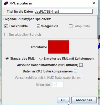 Nachdem also das gewünschte Format ausgewählt wurde, öffnet sich der Exportdialog. Hier kann u.a. festgelegt werden, „was“ wird exportiert und welche Farbe soll der Track später haben. In unserem Fall die Farbe „rot“. Zudem möchte ich die Trackpunkte sowie die Wegpunkte (POI’s) exportieren. Zusätzlich können die Zeitinformationen pro Trackpunkt noch mit exportiert werden. Benötige ich aber nicht. Der festgelegte Titel erscheint später in Google-Maps.