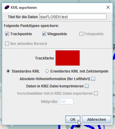 Über „Datei“ lässt sich das Ergebnis in verschiedenen Formaten speichern. In meinem Fall nehme ich „KML“. Es ist das Format für all meine eingesetzten Google Anwendungen und da ich ausschließlich meine Karten in Google Earth und Google Maps verwalte, wähle ich auch dieses Format. Ihr könnt natürlich auch z.B. „GPX“ wählen. Manche Apps auf den Smartphonen „fressen“ dieses Format und so habt Ihr einen portablen Track dabei, wenn den Track etwa nachfahren/laufen möchtet. Auch manche Outdoor-GPS-Uhren oder Smartwatches springen eher auf „GPX“ an. Wie gesagt, es bleibt Euch und dem weiteren Verwendungszweck überlassen.