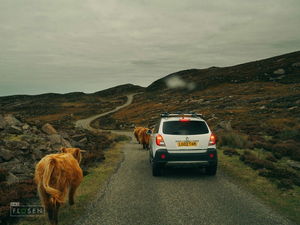 Kommen wir zum Schluss noch auf das Getier zu sprechen. Ihr werdet überwiegend auf Kühe, Moorhühner und vor allem Schafe treffen. Speziell in den Highlands gibt es für diese Tiere keine Begrenzungen! Schafe erkennen einen ziemlich schnell und machen gerade so viel Platz, damit man vorbei kommt. So gut wie keine reagieren dabei ängstlich! Moorhühner werdet ihr mehr tot als lebendig zu Gesicht bekommen. Fast überall entlang der SingleTrackRoads sieht man sie liegen. Bei (Highland)Cows hingegen ist etwas Geduld gefragt. Ihr werdet sie oftmals nicht überholen können, sondern müsst gemächlich hinter ihnen herfahren. Mit etwas Glück kann man es vielleicht an einem Passing Place versuchen, aber gerade bei mehreren Tieren würde ich von diesem Vorhaben absehen. Und glaubt mir… die werden keine Anstalten machen, die Straße auf dem schnellsten Wege zu verlassen. Wir mussten gut 30 Minuten hinter einer 4er-Herde herfahren. Als sich dann Teile der Herde auch noch zurückfallen ließen und mir ein durchaus imposantes Horn neben dem Fenster „Hallo“ sagte, fuhr ich gerne vorsichtig hinterher *lach*.
