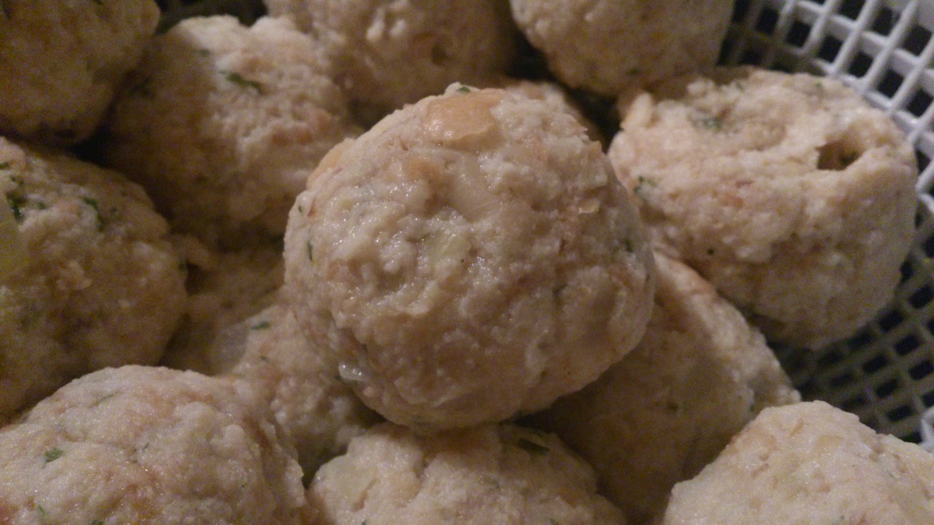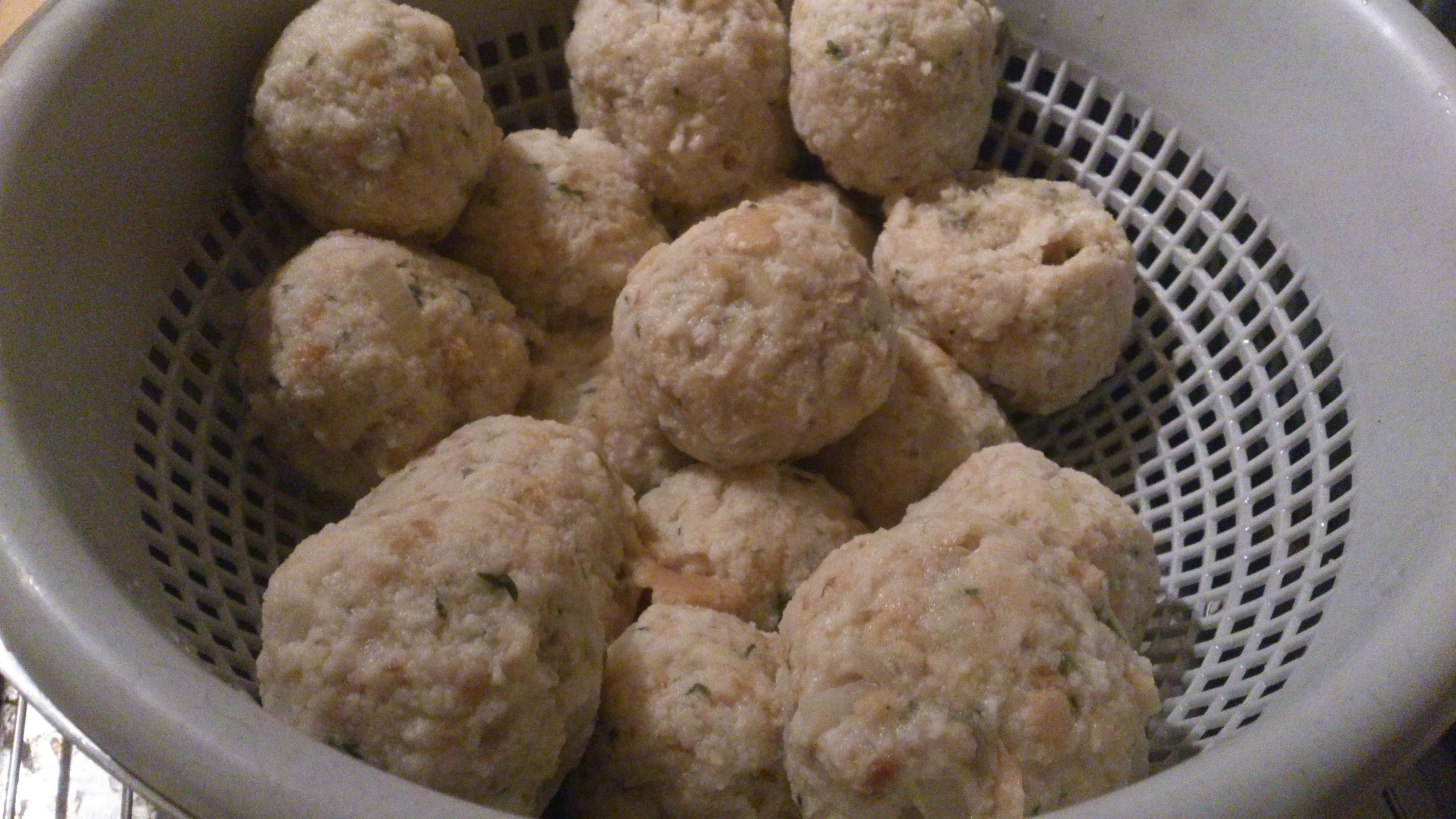 Mit feuchten Händen mittelgroße Knödel formen und im kochenden Salzwasser ca. 15 Minuten lang mehr ziehen als kochen lassen.