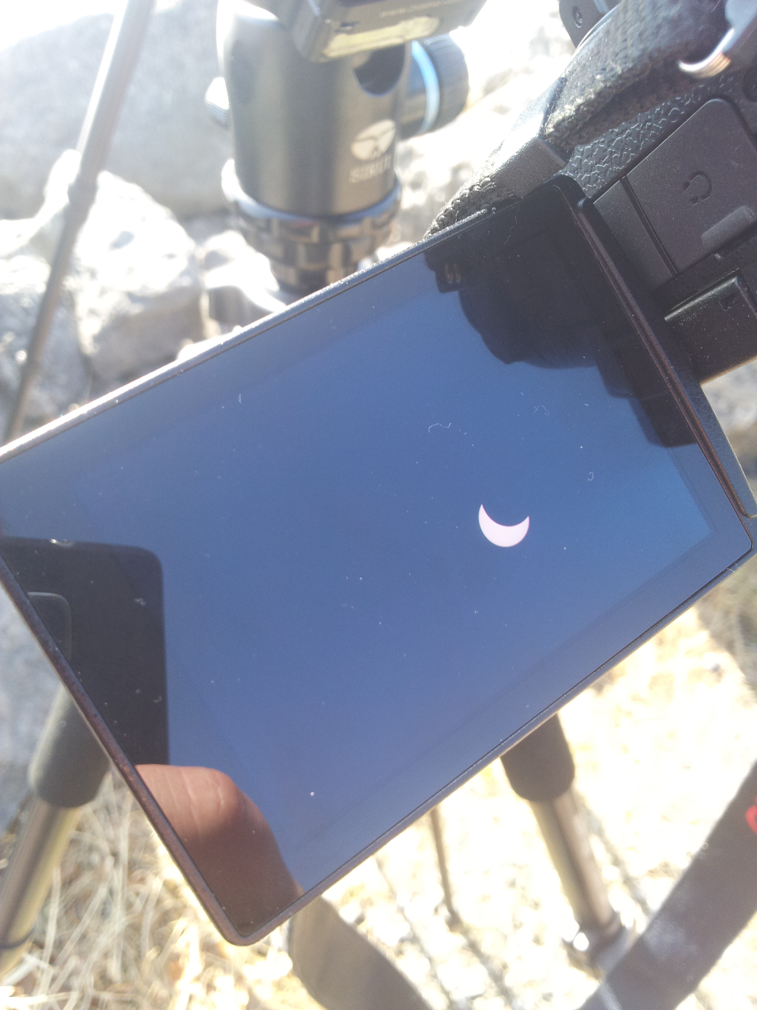 Irgendwann war es dann soweit. Ca. 9:30 Uhr MEZ, 2015 n. Chr.d.E. – Erstkontakt! Helle Aufregung. Die Olympus lief noch. Speicherkarte und Akku waren im grünen Bereich. Das Tele ausgerichtet. Im Abstand von ner Minute schoss ich ständig Belichtungsreihen. Ich war mir bei den Testaufnahmen zuvor nicht sicher, welche Einstellung mir persönlich später am Rechner mehr gefällen würde. Eher mit etwas „Glow“ oder die Belichtung, auf der man sogar die Sonnenflecken erkennen könne.