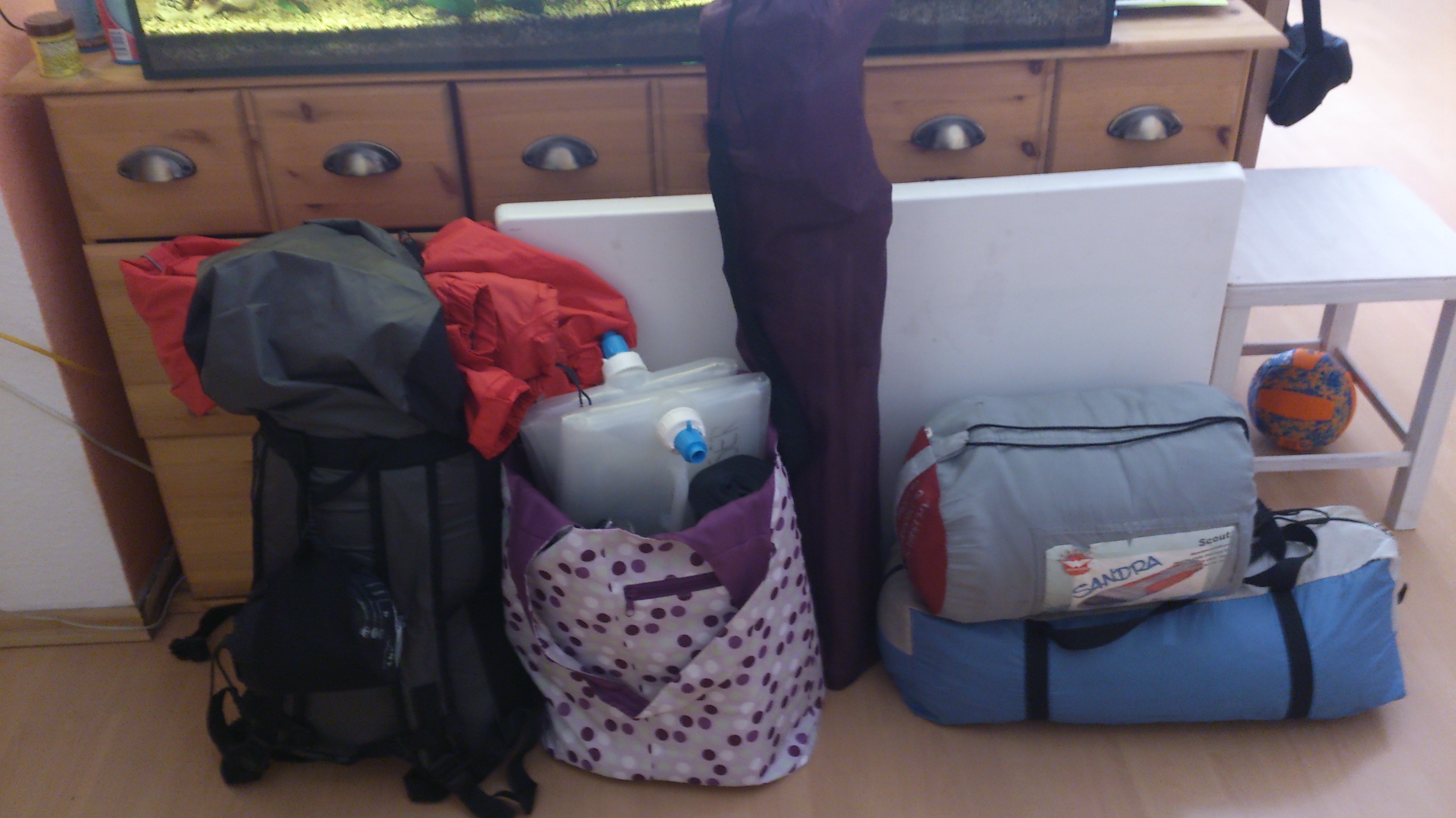 Richtig! Das sollte alles in einen Rucksack. Die Lebensmittel waren da auch noch nicht einkalkuliert.