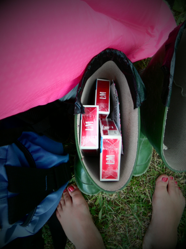 Freitag hieß vorerst das Motto die fremden Leute und ihr doofes Zelt aus unserem Garten zu bekommen. Es nieselte und wir wollten gemütlich Kaffee kochen und das unter dem Pavillon. Anne hatte eine mega Idee. Den Topf und den Deckel zusammenschlagen und krach machen. 🙂 Das hat geholfen und der Typ wurde wach, kroch aus dem Zelt und entschuldigte sich 100000 x. Seine Freundin war da nicht so begeistert. Aber auch ihr war es peinlich. Sie hatten nachts die anderen ihrer Gruppe nicht gefunden und dachten sie seien richtig. Naja, shit happens! Bis sie sich verzogen hatten, verging eine gefühlte Ewigkeit.