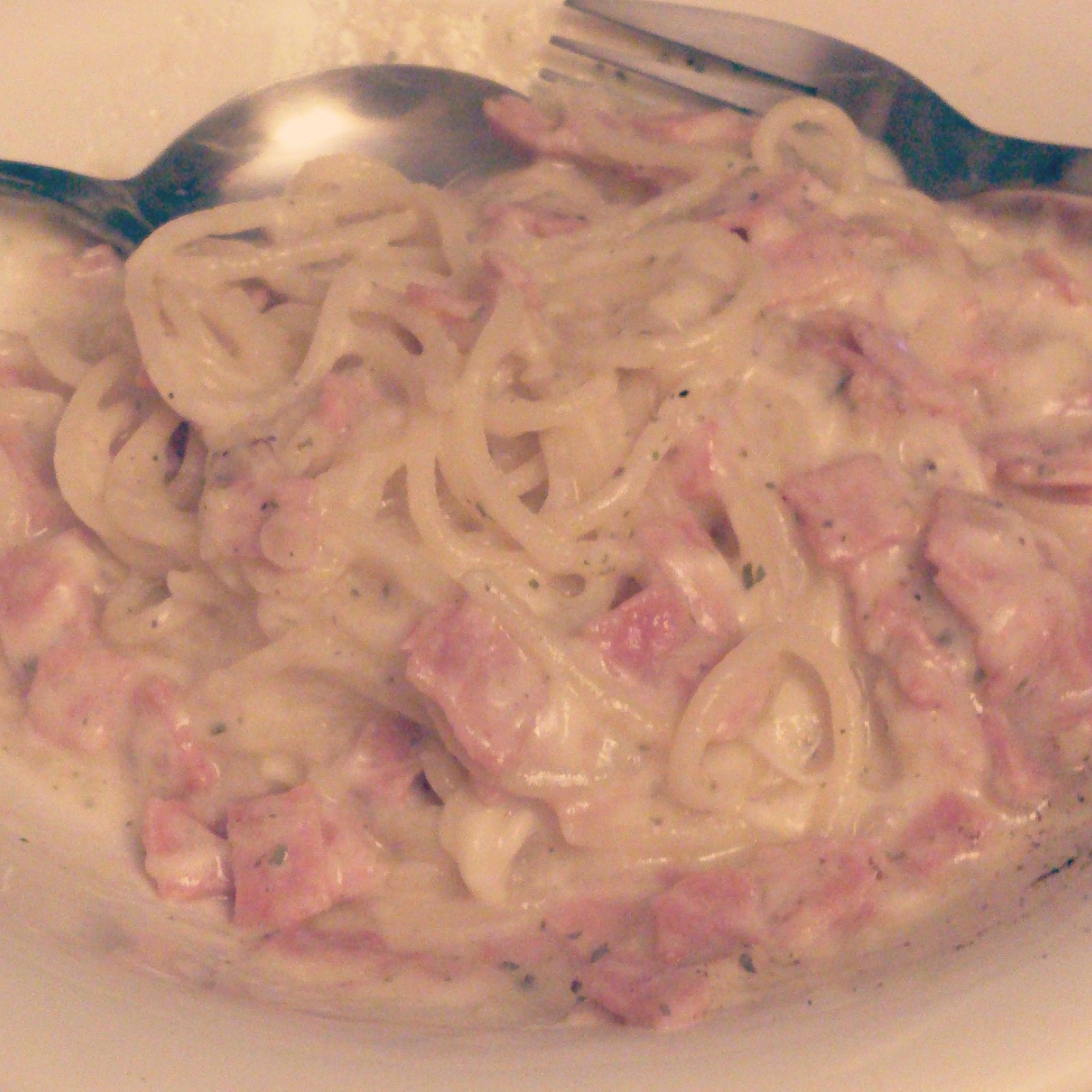 Zwiebel und Speck würfeln und in der Butter anbraten. In einer Schüssel Eier, Käse, Salz und viel Pfeffer verrühren. Spaghetti, Speck und Zwiebeln dazu geben und umrühren. Mit Parmesan bestreuen.