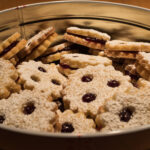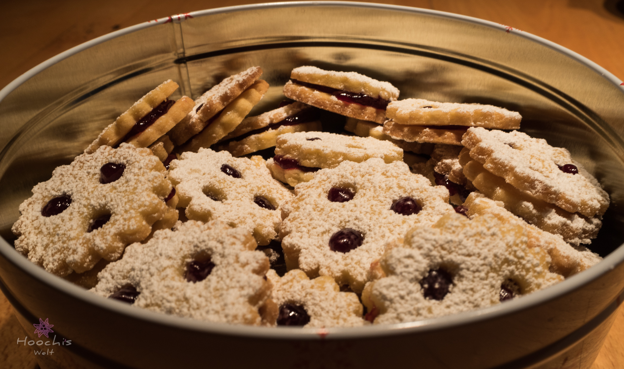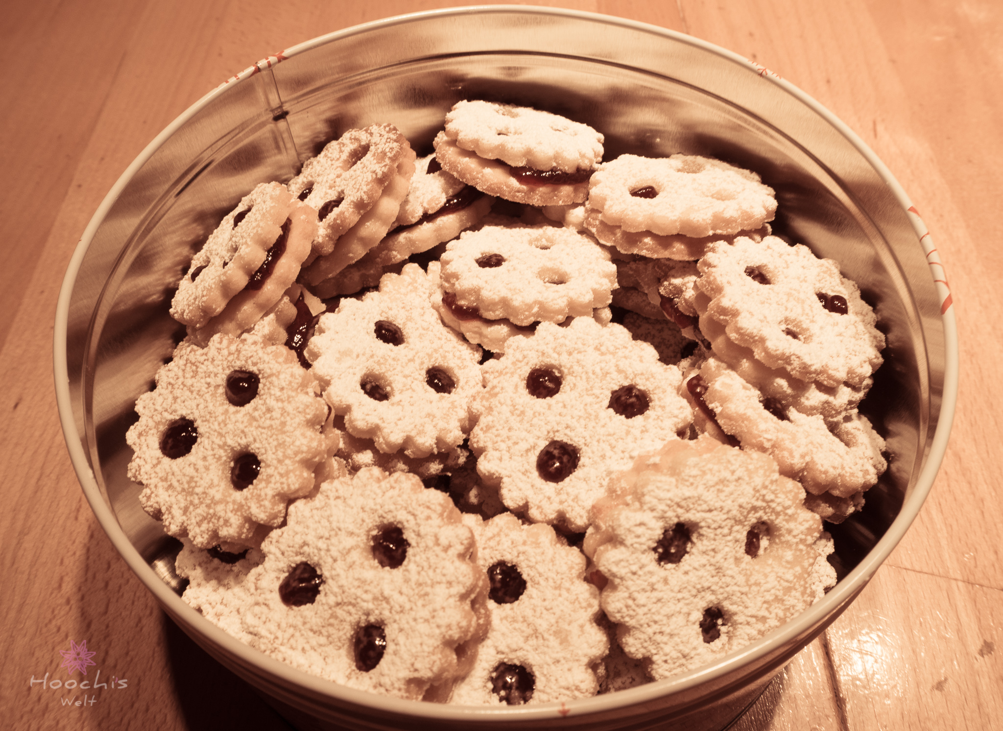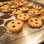 Die gebackenen Kekse nun aus dem Ofen nehmen und abkühlen lassen. Anschließend die Unterteile (die ohne Loch) mit Marmelade bestreichen und das Oberteil darauf legen. Mit Puderzucker bestäuben und genießen.