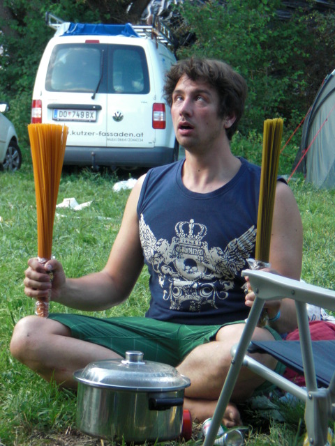 Beate & Petra sind dann kurz davor zum einkaufen gegangen. Grillutensilien, Spaghetti mit Tomatensoße, Salat, Frühstück, Dosenbier, Radler, Sekt, Wodka… Halt alles, was man für ein Luxusfestival benötigt. Sogar an die Eierbecher wurde gedacht, damit man auch ein Frühstücksei bekommt. 😀