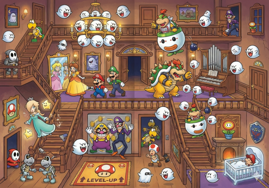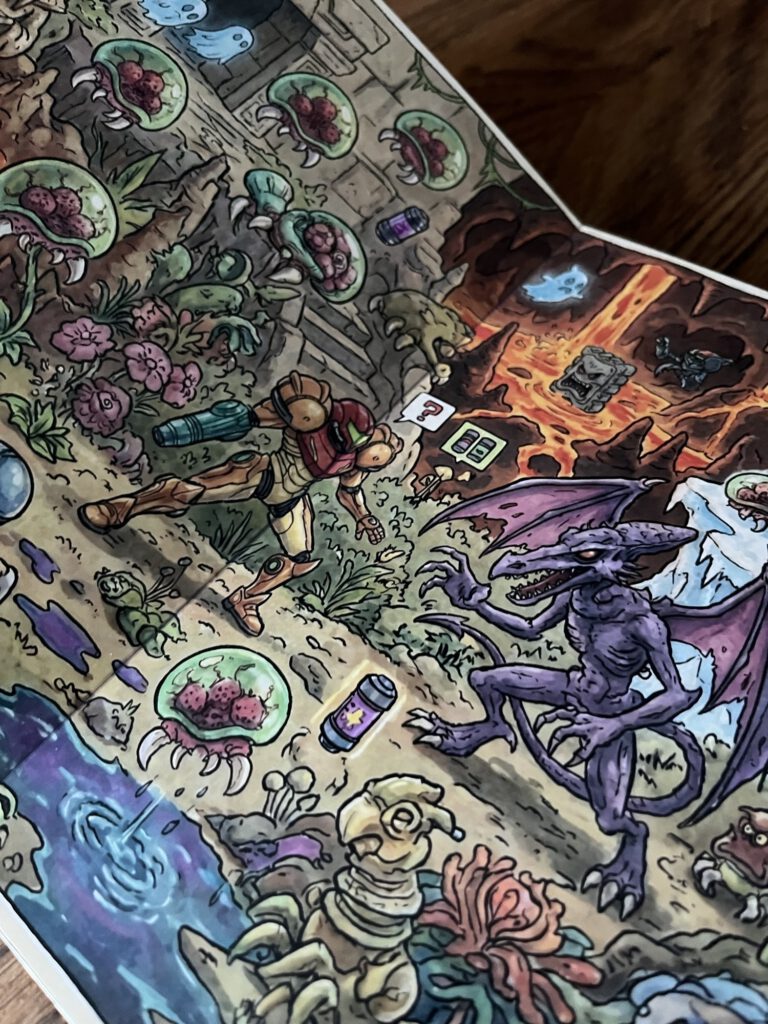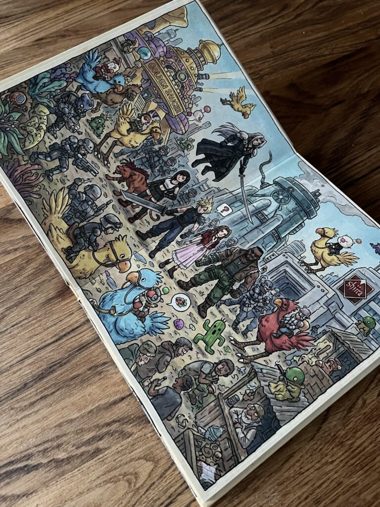 So. Nach diesem „Erfolgt“ kann es dann natürlich nicht nur bei einem Wimmelbuch bleiben. Ich hab da noch ein Weiteres erstellt und andere GamingUniversen einfließen lassen. Anderer Stil und noch mehr „Wimmelei“. Die Weiterenntwicklung des oben genannten Masterprompts. Natürlch kommt auch hier wieder Mario vor, aber eben auch Donkey Kong, Samus von Metroid Prime, Final Fantasy VII usw.