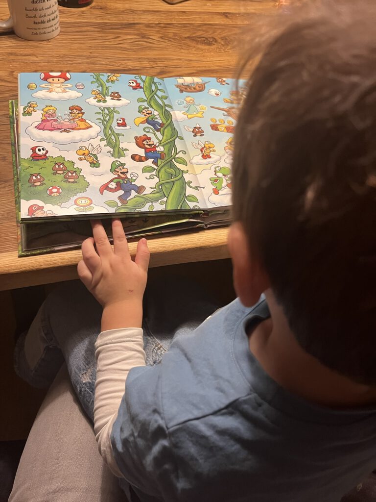 Da ich Nintendo bzw. Mario Fan bin und der Kleine schon ab und zu mal zusehen darf, sind ihm die ganzen Charakter schon geläufig. Evtl. hat hier auch unser Japantrip noch seinen Teil dazu beigetragen *zwinker* Auf jedenfall habe ich mir gedacht… warum nicht ein Mario Wimmelbuch. Doppelseitig. Verschiedene Settings.