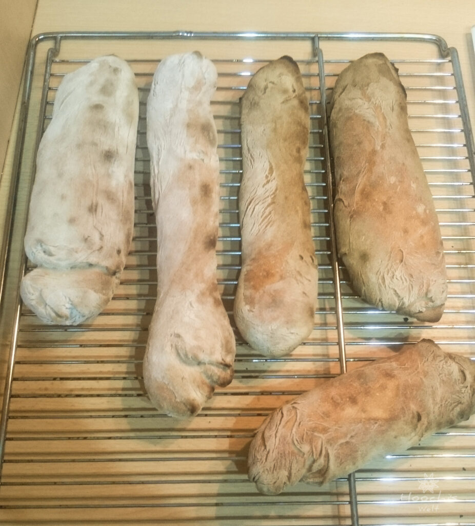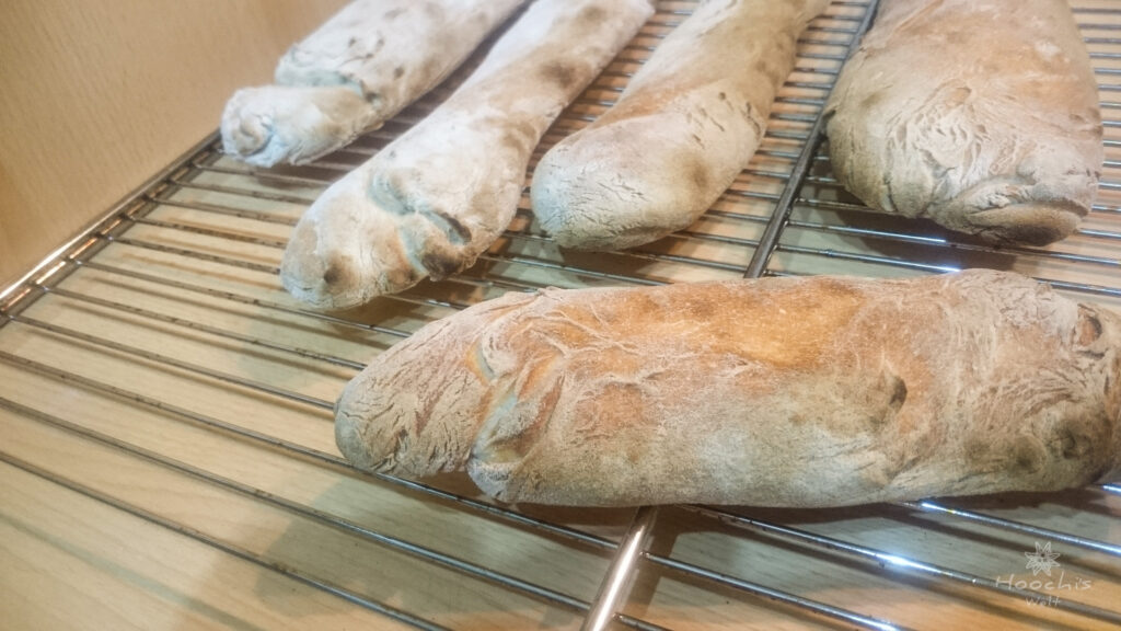 Wer möchte, kann noch eine mit Wasser gefüllte Schale auf den Boden des Backofens stellen oder die Baguettes mit Wasser besprühen, wenn sie in den Ofen kommen, dann werden sie noch etwas krosser (ich hatte nichts dergleichen getan).
