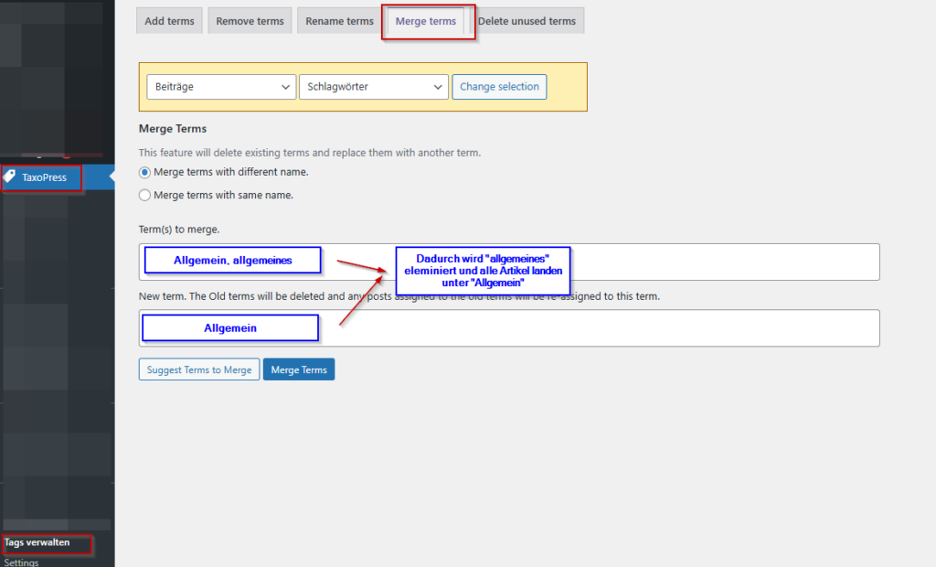 Ich hatte nach dem Merge doppelte Kategorien und Tags. Diese hab ich mit dem WordPress Plugin „TaxoPress“ gerade gezogen. Damit lassen sich Kategorien zusammenführen, Tags vereinfachen usw.
