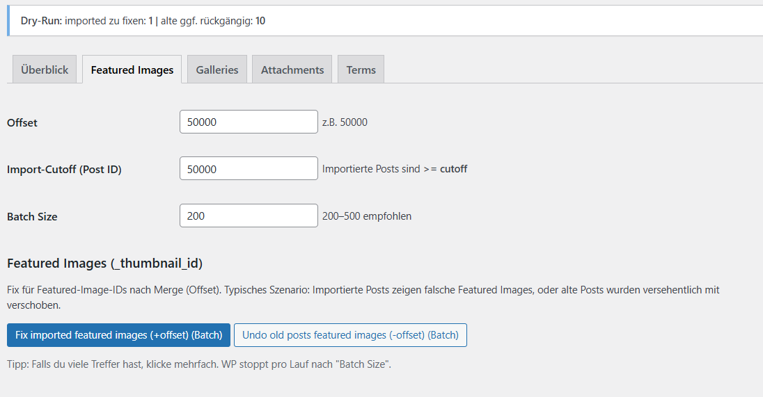 Jetzt fahren wir dann tatsächlich 2-Gleisig. Mit SQL kommen wir nämlich ab sofort nicht mehr wirklich weiter, oder es wäre deutlich aufwendiger. Darum benutzt Ihr jetzt entweder mein bereits mehrfach verlinktes und erwähntes Plugin, ein eigenes PHP-Snippet oder geht den Weg über CLI. Ich erklärs mit meinem Plugin + CLI. Der Weg über das PHP-Snippet wurde bereits im Artikel „Bilderkauderwelsch – Korrupte und fehlerhafte Galeriebilder nach einem WordPress Merge wiederherstellen“ erwähnt. Im Endeffekt machen wir genau das. Nur ich wollte es alternativ dieses mal erledigen, die Logik wusste ich ja nun. So ist auch mein WP-Plugin enstanden *yeah*.