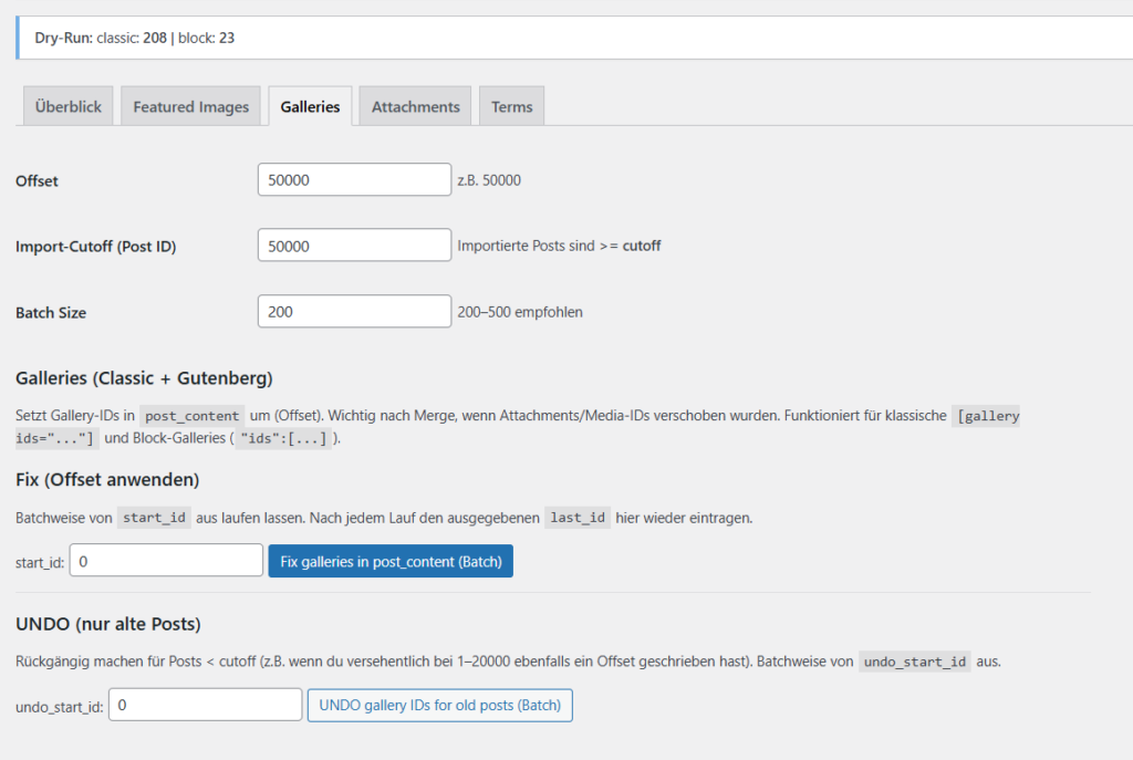 oder Block-Gallery. Diese beinhalten die ursprünglichen Bilder-ID’s. Da wir diese aber mit einem Offset +50.000 versehen haben, passen diese selbstverständlich nun nicht mehr zusammen.