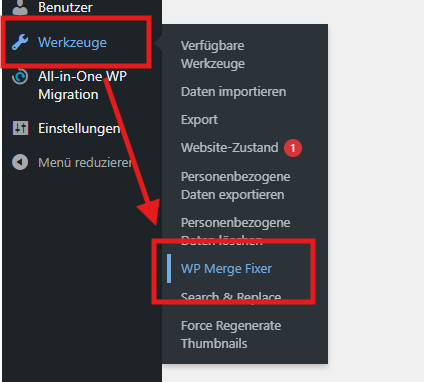 Und im Menü unter „Werkzeuge“ findet Ihr jetzt den Menü-Eintrag „WP Merge Fixer“.