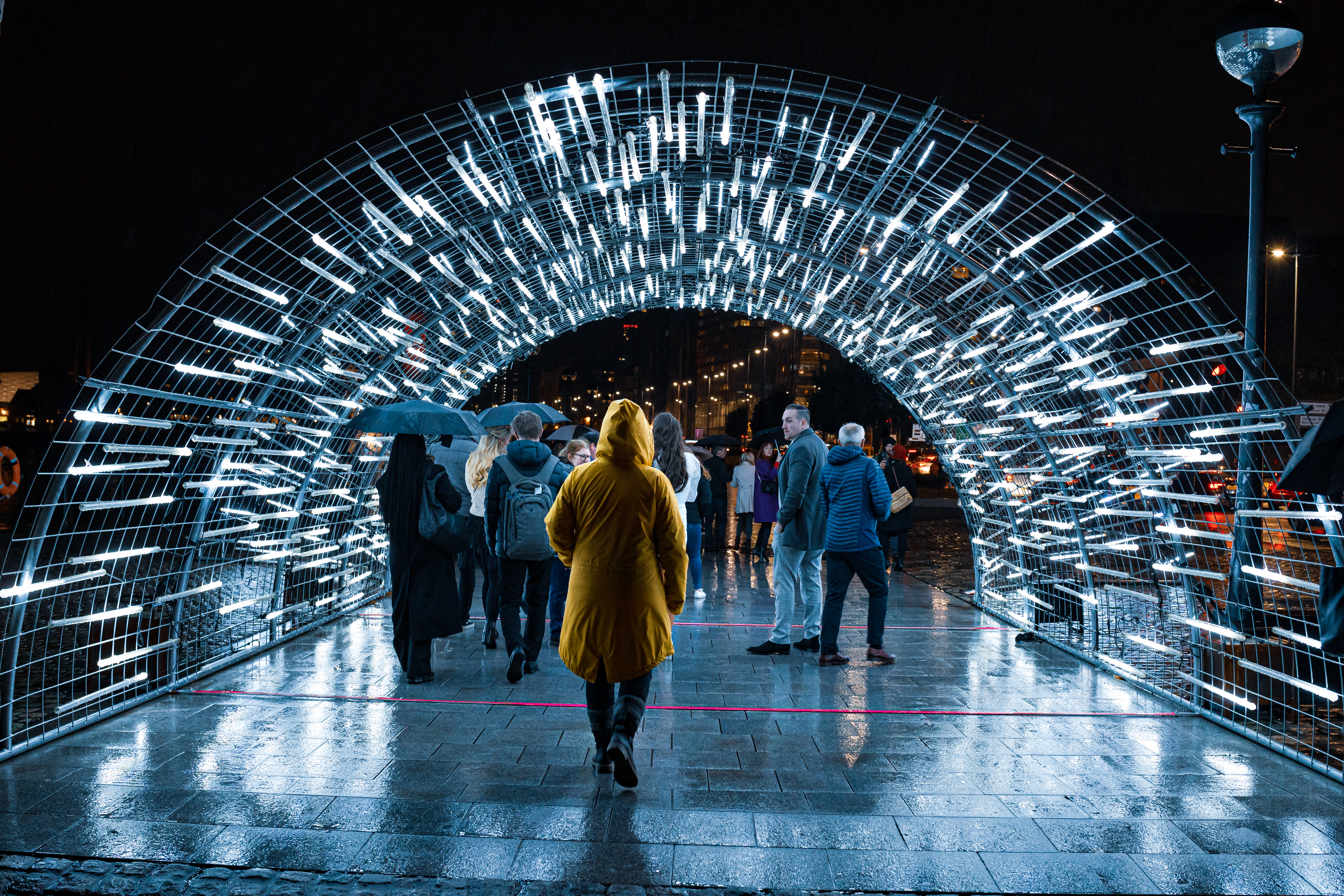 Was wir nicht wussten. Es gastierte zu der Zeit „River of Light“ Festival in Liverpool. Überall waren Lichtinstallationen aufgebaut…