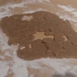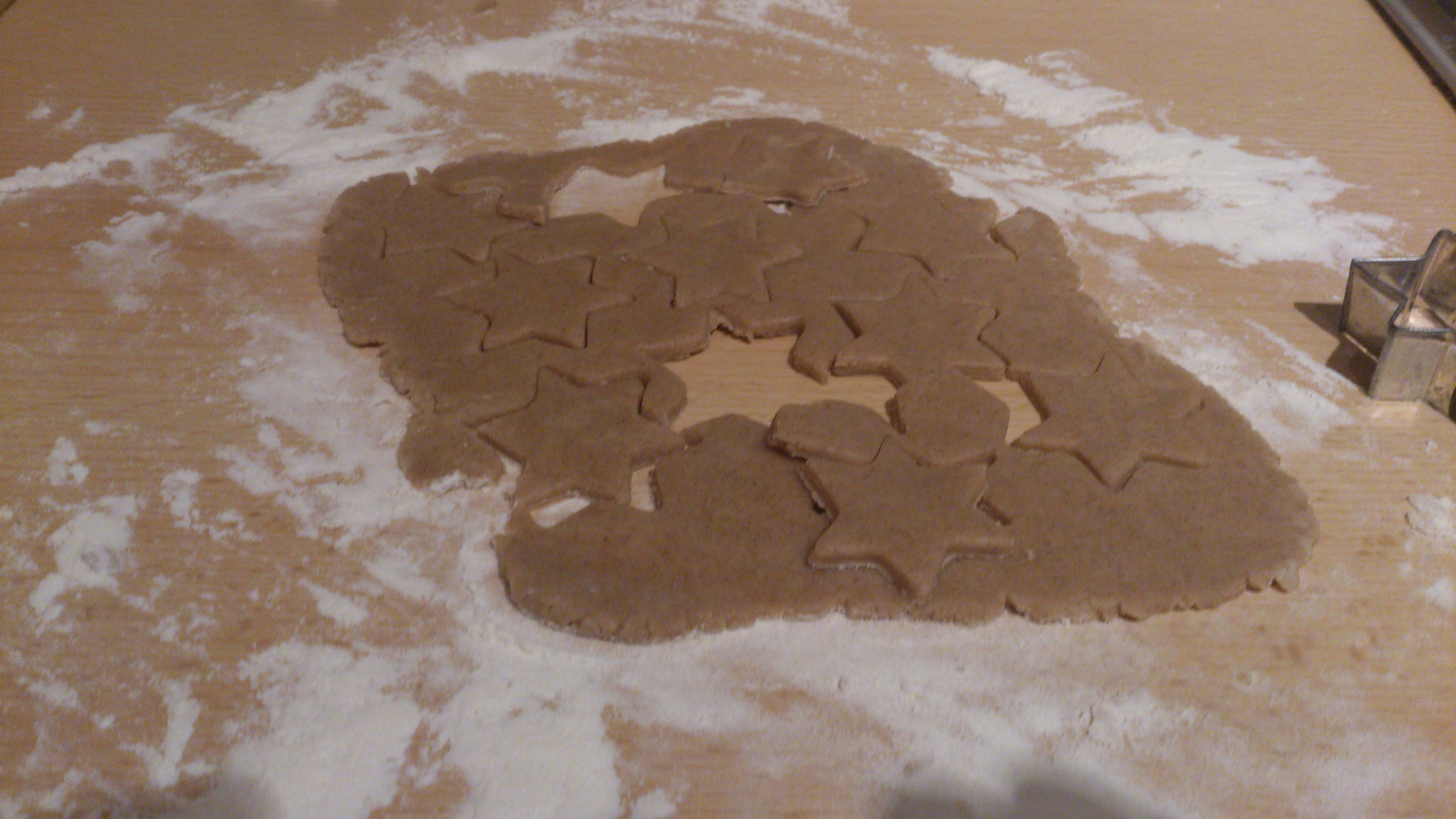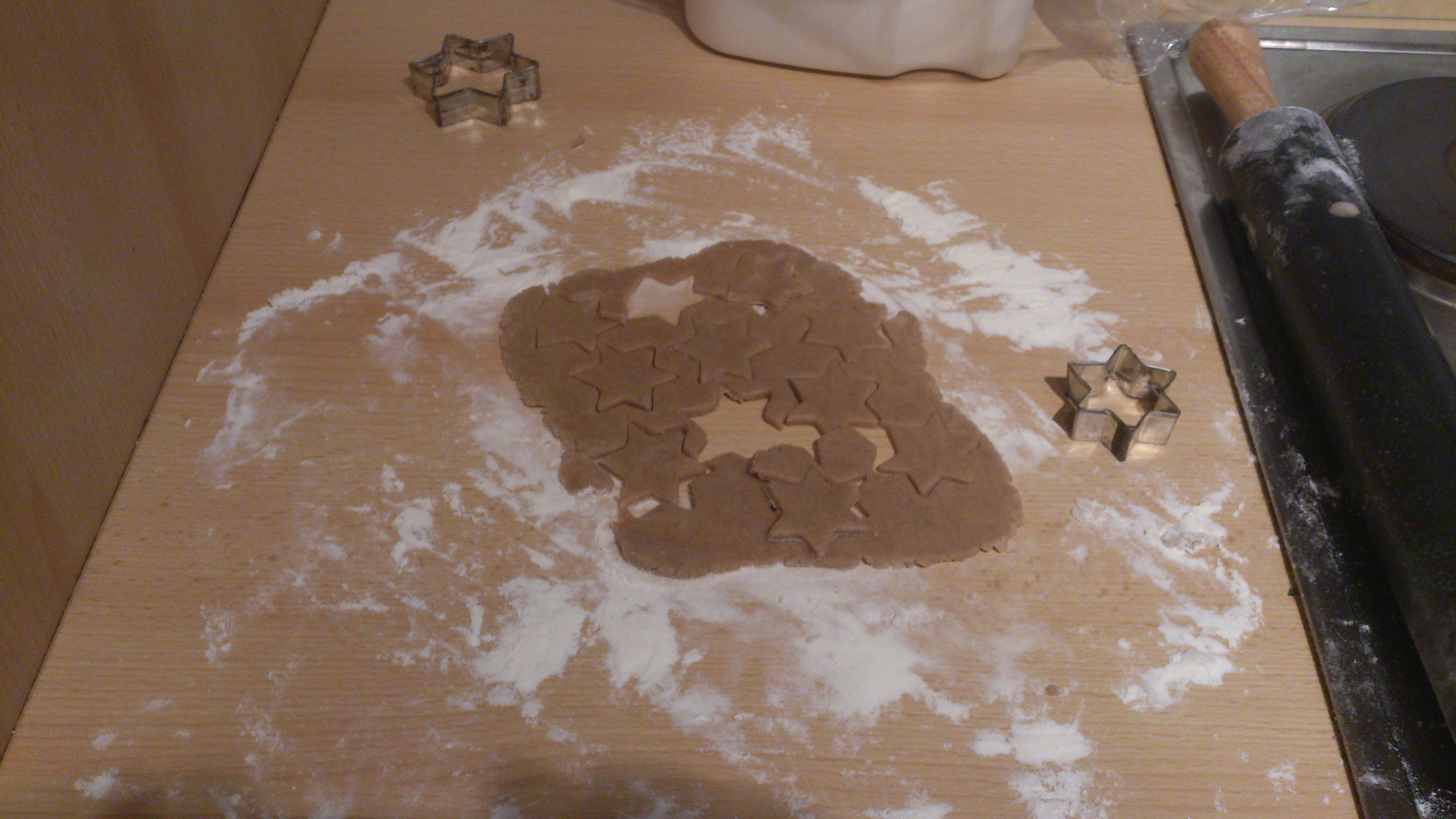 Den Teig auf eine bemehlten Arbeitsfläche ausrollen, Sterne ausstechen und auf das Backblech legen.