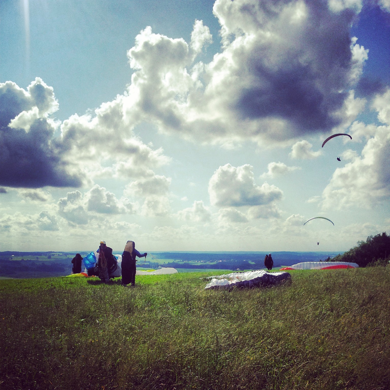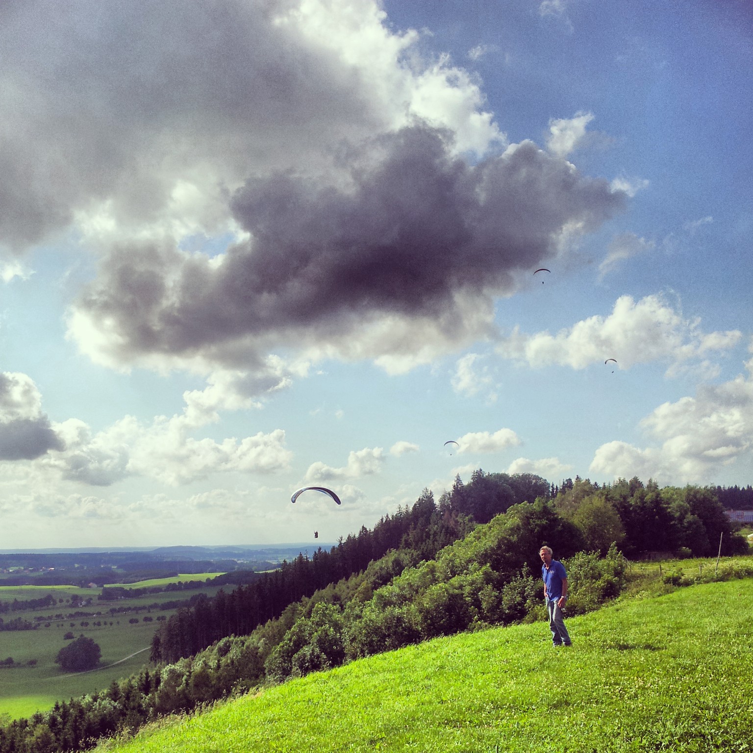 Als ich auf Höhe Schrattenbach war, sah ich die Gleitschirme über mich schweben. „Oha, die Springen ja Heute. Cool!“ dachte ich mir so und fuhr erstmal weiter. Plötzlich packte sie mich. Die Lust aufs Fotografieren. „Jetzt oder nie“ sagte ich im Auto vor mich hin und drehte um. Auf gings zur Absprungkante der Gleichtschirmflieger.